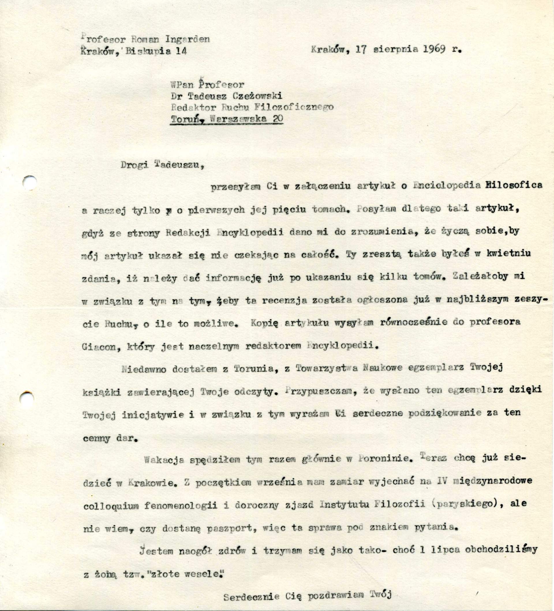 przesyłam Ci w załączeniu artykuł o Enciclopedia Filosophica a raczej tylko o pierwszych jej pięciu tomach. Posyłam dlatego taki artykuł, gdyż ze strony Redakcji Encyklopedii dano mi do zrozumienia, że życzą sobie, by mój artykuł ukazał się nie czekając na całość. Ty zresztą także byłeś w kwietniu zdania, iż należy dać informację już po ukazaniu się kilku tomów. Zależałoby mi w związku z tym na tym, żeby ta recenzja została ogłoszona już w najbliższym zeszycie Ruchu, o ile to możliwe. Kopię artykułu wysyłam równocześnie do profesora Giacon, który jest naczelnym redaktorem Encyklopedii.