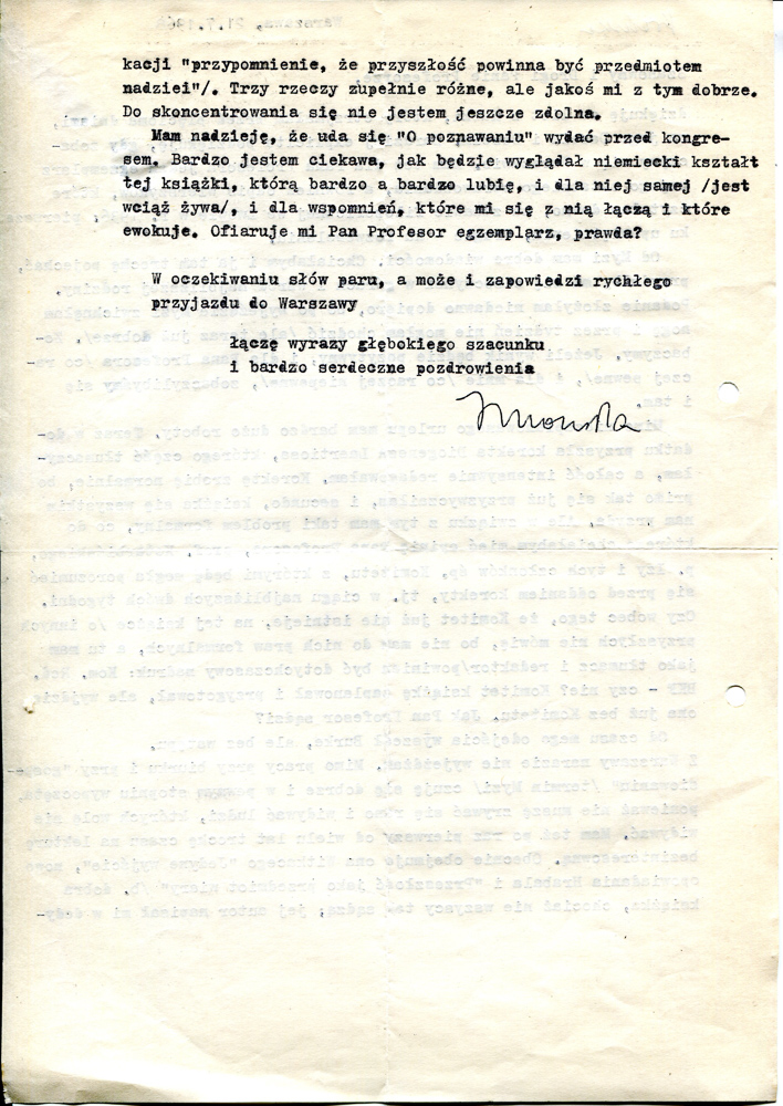 x Mam nadzieję, że uda się „O poznawaniu” wydać przed kongresem. Bardzo jestem ciekawa, jak będzie wyglądał niemiecki kształt tej książki, którą bardzo a bardzo lubię, i dla niej samej /jest wciąż żywa/, i dla wspomnień, które mi się z nią łączą i które ewokuje. Ofiaruje mi Pan Profesor egzemplarz, prawda?