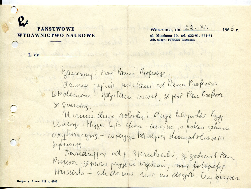 c Dowiaduję się od p. Gierulanki, że zostawił Pan Profesor, zapewne jeszcze we wrześniu, inną fotografię Husserla – ale do nas nic nie doszło. Czy Szwagier Pana Profesora miał ją nam przesłać? Czy zatelefonować, żebyśmy posłali? Nic takiego nie nastąpiło – a telefonu płk. Pola, ani adresu, nie znam. Może Pan Profesor napisze – spróbuję, w razie otrzymania fotografii w najbliższych dniach, czy nie dałoby się jeszcze wymienić (chociaż jest już dość późno).