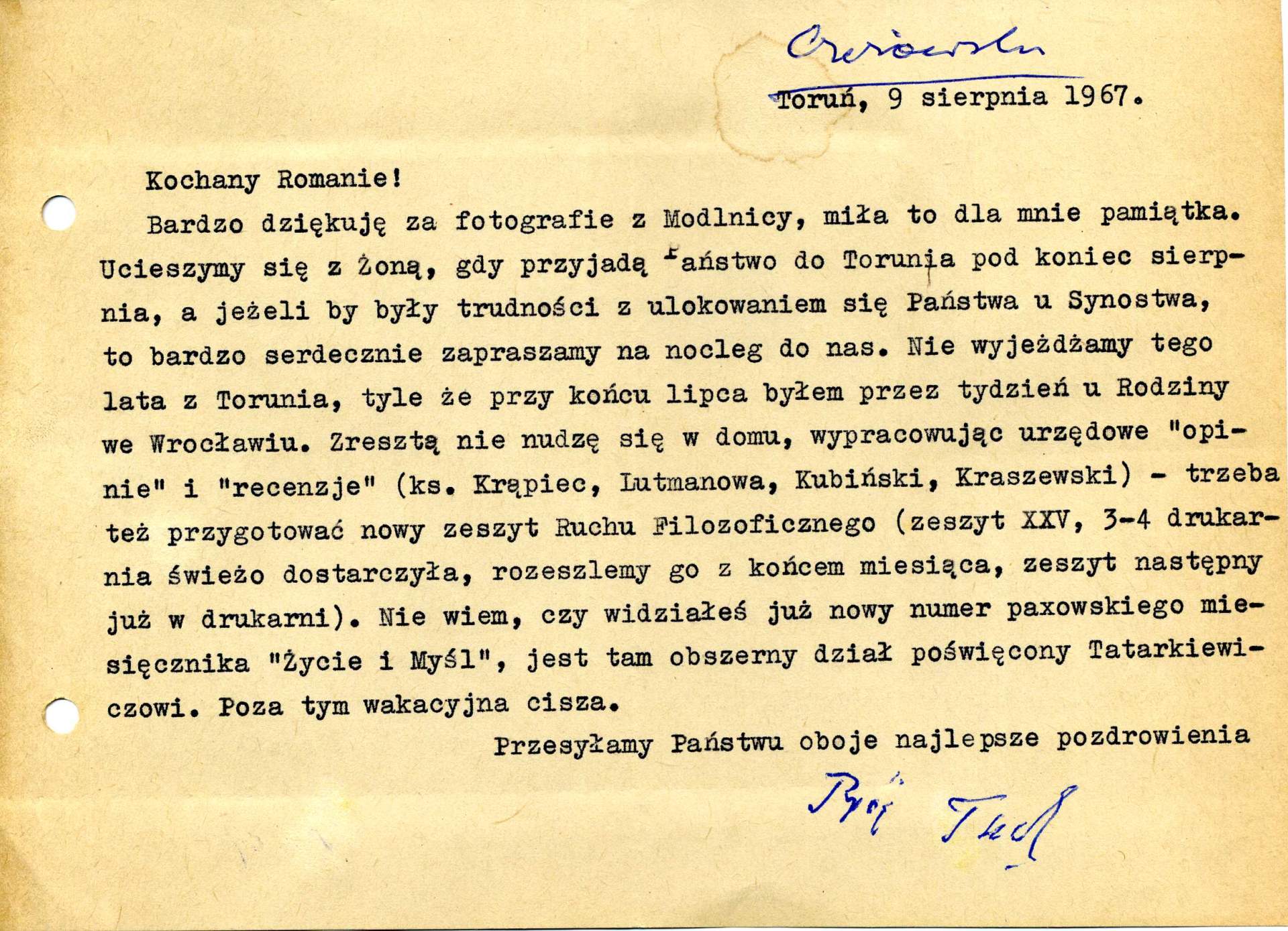 Bardzo dziękuję za fotografie z Modlnicy, miła to dla mnie pamiątka. Ucieszymy się z Żoną, gdy przyjadą Państwo do Torunia pod koniec sierpnia, a jeżeli by były trudności z ulokowaniem się Państwa u Synostwa, to bardzo serdecznie zapraszamy na nocleg do nas. Nie wyjeżdżamy tego lata z Torunia, tyle że przy końcu lipca byłem przez tydzień u Rodziny we Wrocławiu. Zresztą nie nudzę się w domu, wypracowując urzędowe „opinie” i „recenzje” (ks. Krąpiec, Lutmanowa, Kubiński, Kraszewski) – trzeba też przygotować nowy zeszyt Ruchu Filozoficznego (zeszyt XXV, 3-4 drukarnia świeżo dostarczyła, rozeszlemy go z końcem miesiąca, zeszyt następny już w drukarni). Nie wiem, czy widziałeś już nowy numer paxowskiego miesięcznika „Życie i Myśl”, jest tam obszerny dział poświęcony Tatarkiewiczowi. Poza tym wakacyjna cisza.