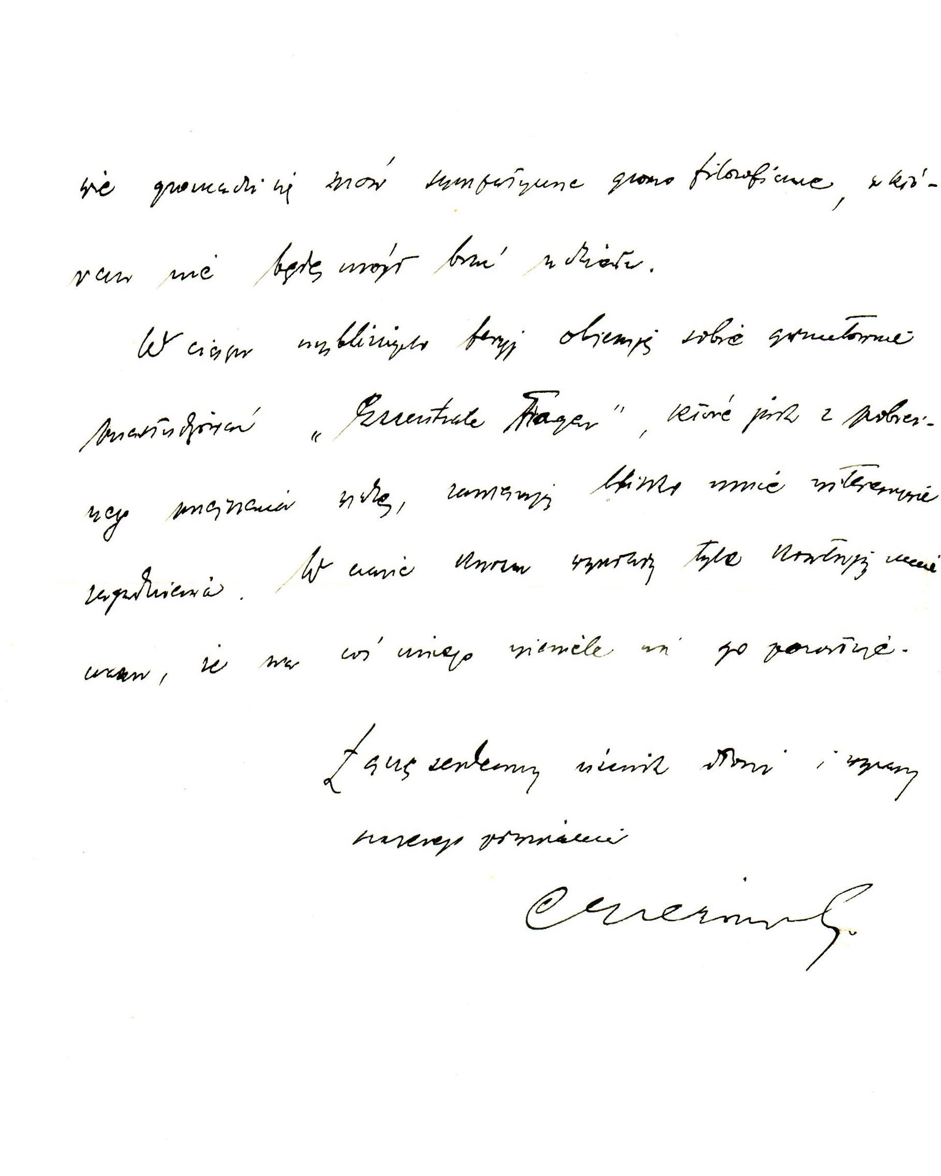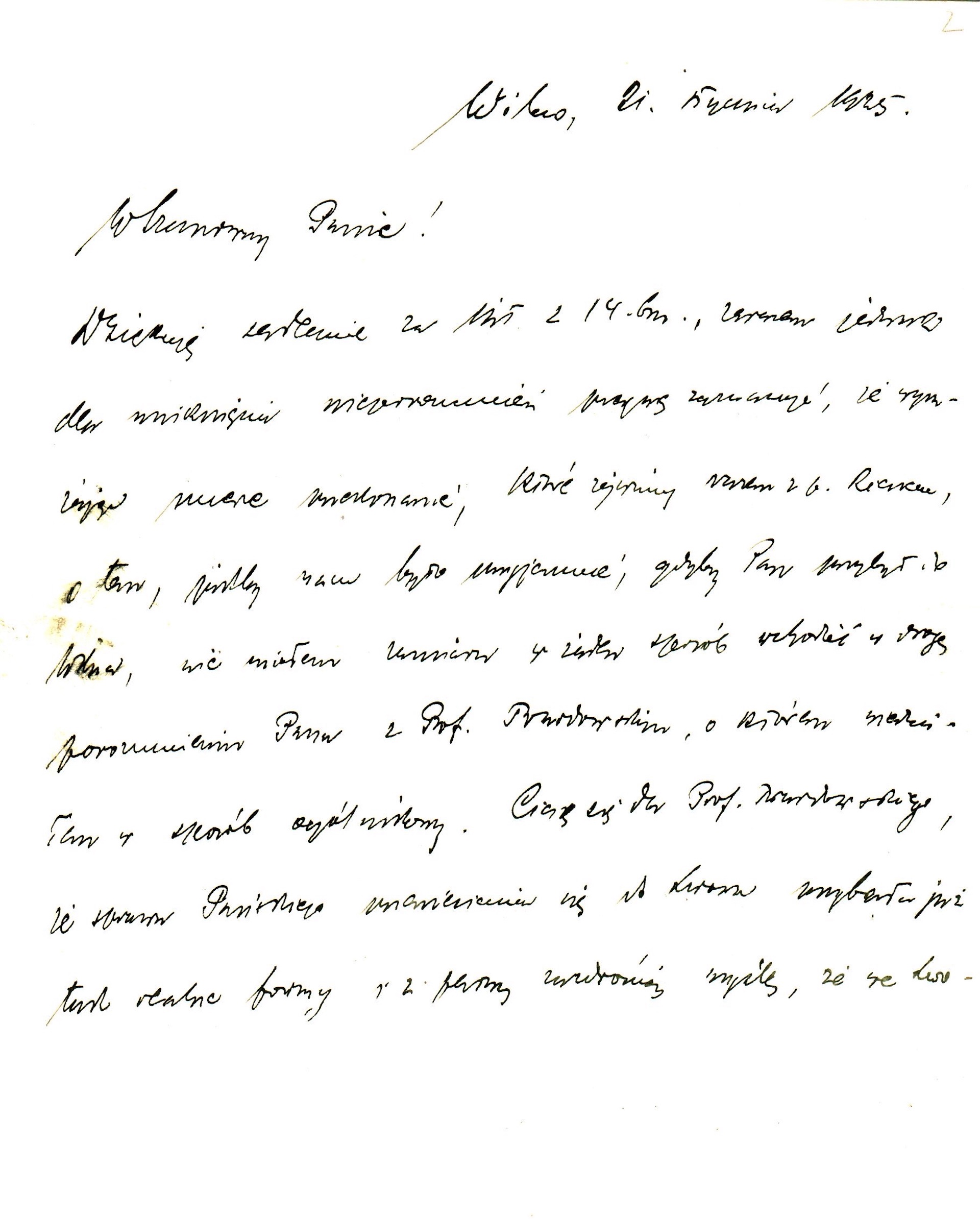 Dziękuję serdecznie za list z 14. bm., zarazem jeszcze dla uniknięcia nieporozumienia pragnę zaznaczyć, że wyrażając nasze przekonanie, które żywimy razem z p. Riemerem, o tem, jakby nam było przyjemnie, gdyby Pan przybył do Wilna, nie miałem zamiaru w żaden sposób wchodzić w drogę porozumieniu Pana z Prof. Twardowskim, o którem wiedziałem w sposób ogólnikowy. Cieszę się dla Prof. Twardowskiego, że sprawa Pańskiego przeniesienia się do Lwowa nabrała już tak realne formy i z pewną zazdrością myślę, że we Lwowie gromadzi się znów sympatyczne grono filozoficzne, w którym nie będę mógł brać udziału.